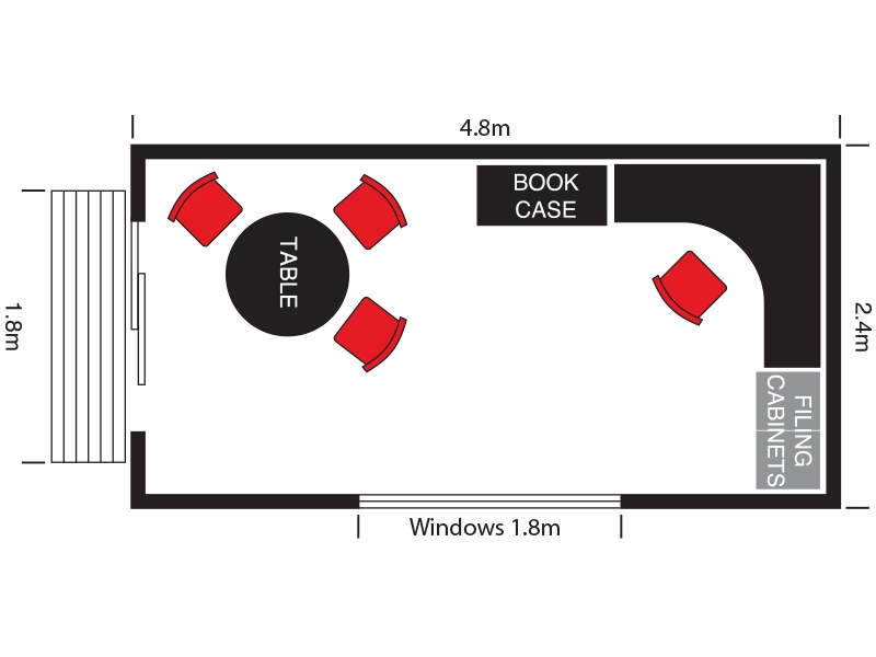Operating a professional business has never been easier, with plenty of space for a large corner desk, a consultation table for client meetings and storage space. Plus, with a double-open window, this transportable cabin feels light and airy.